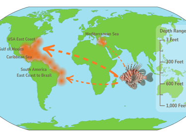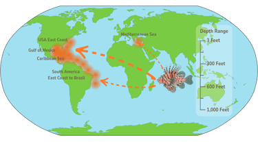 At the same time, adult lionfish occupy an unusually wide depth range—from 3 feet to 300 feet—well beyond the recommended diving limit of 130 ft (40 m), placing them out of reach of recreational divers.