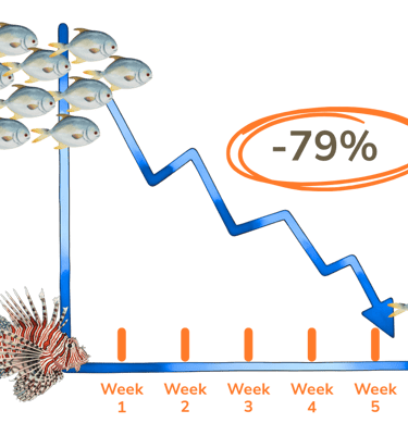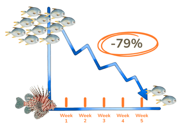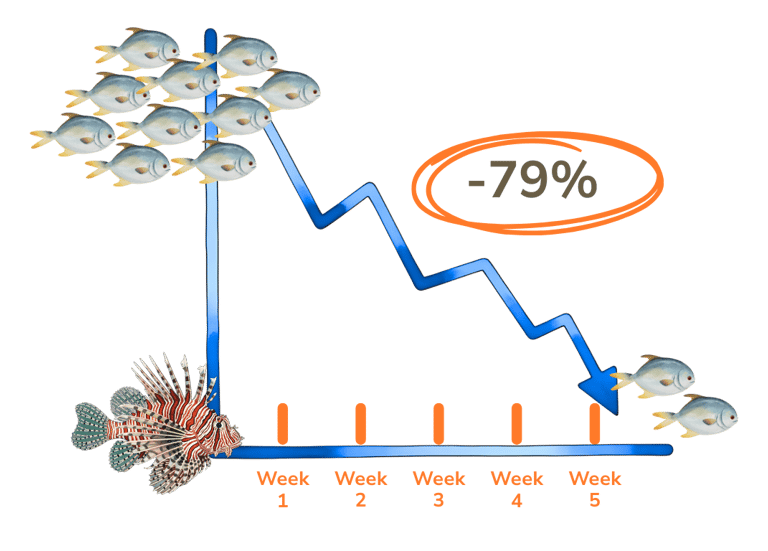 One single lionfish can reduce juvenile reef fish biomass by up to 79% in under 5 weeks on a small reef patch (Albins & Hixon, 2008).
