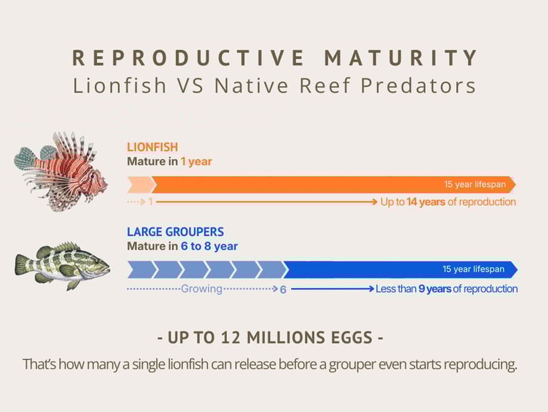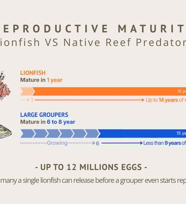 Lionfish can live up to 15 years and begin reproducing in about one year, far earlier than many native predators. At the same time, they feed heavily on fish juveniles and other creatures essential to a healthy reef. This means lionfish not only reproduce faster, but also directly reduce the reproductive success of other reef fish by removing the next generation before it can mature.