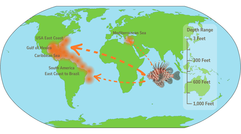 Today, lionfish are invasive across the Caribbean Sea, the Gulf of Mexico, the western Atlantic from Florida to North Carolina, and along parts of the northern South American coast, with recent expansion into Brazil.